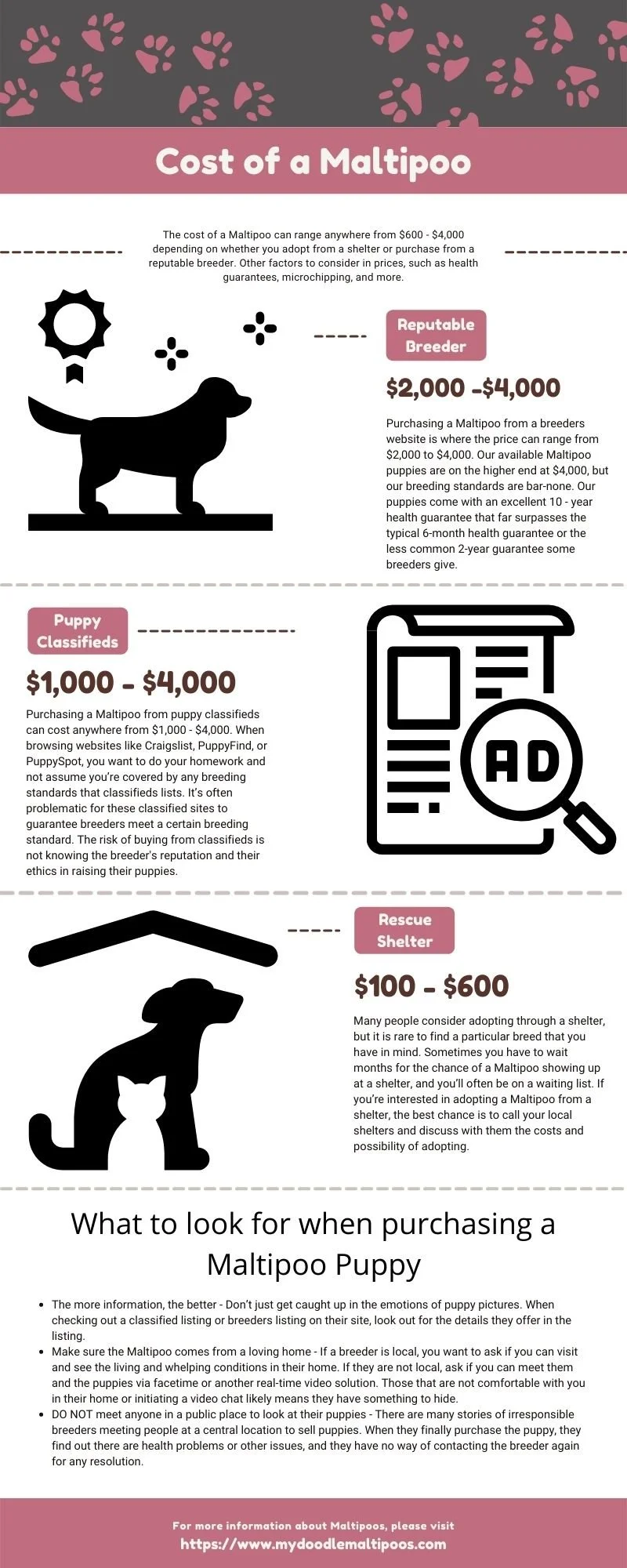 Purchasing a Maltipoo from a puppy classifieds can cost anywhere from $1,000 - $4,000. When browsing websites like Craigslist, PuppyFind or PuppySpot you want to do your homework and not assume you’re covered by any breeding standards that a classifieds lists. It’s often hard for these classified sites to guarantee breeders meet a certain breeding standard. The risk of buying from a classifieds is not knowing the reputation of the breeder and their ethics in raising their puppies.